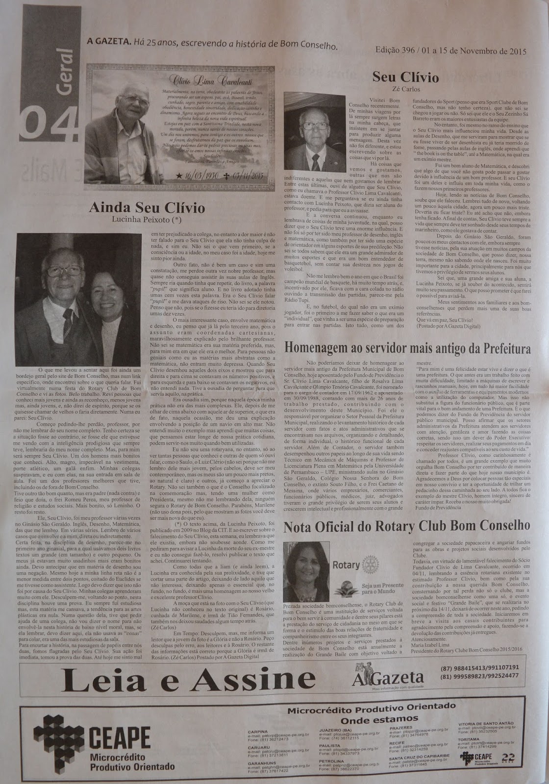 O jornal “A Gazeta” de Bom Conselho já se encontra em circulação trazendo os fatos que foram notícia neste mês de novembro em Bom Conselho e região. A edição de numero 396 vem trazendo em destaque, entre outros assuntos, uma página exclusiva sobre Clívio Lima Cavalcante (prof. Clívio).
