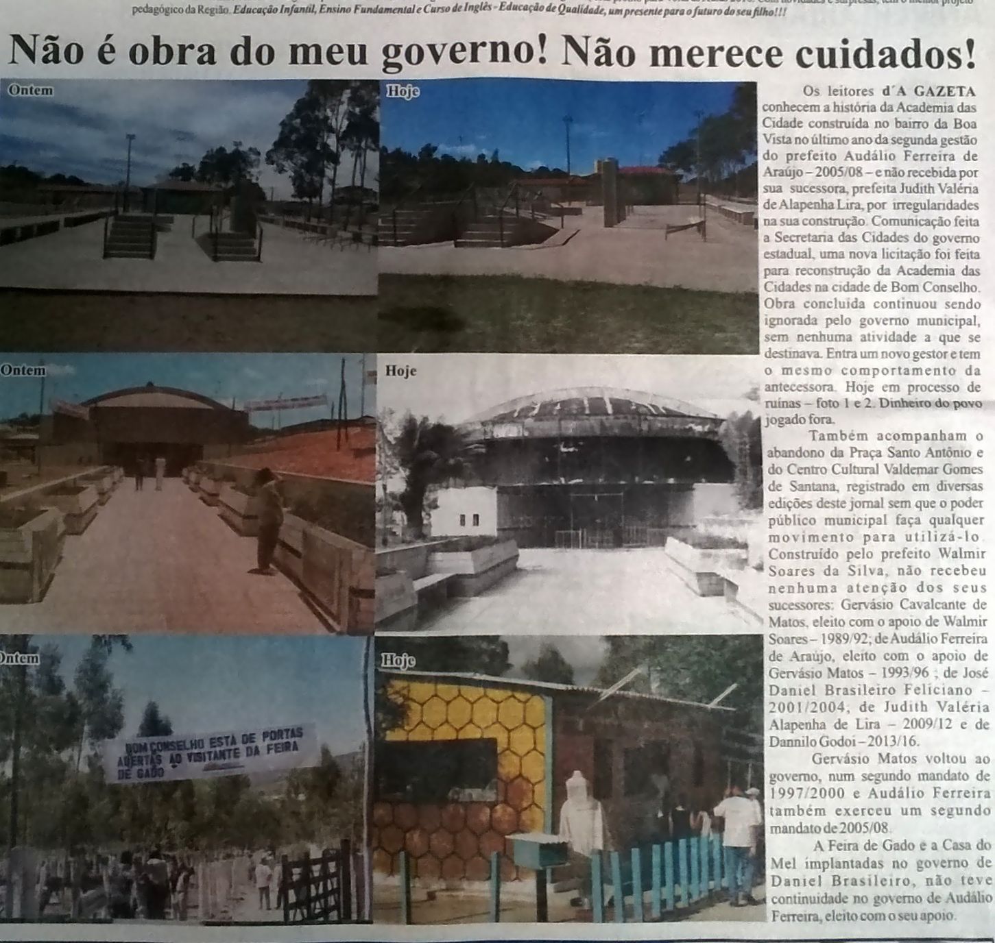 Lendo a contracapa do jornal “A Gazeta” de Bom Conselho, na edição recente de Nº403, o editor reservou uma página inteira dedicada á obras realizadas em governos passados, e que infelizmente não tiveram os cuidados necessários pelos seus sucessores, para que perdurassem até os dias de hoje.