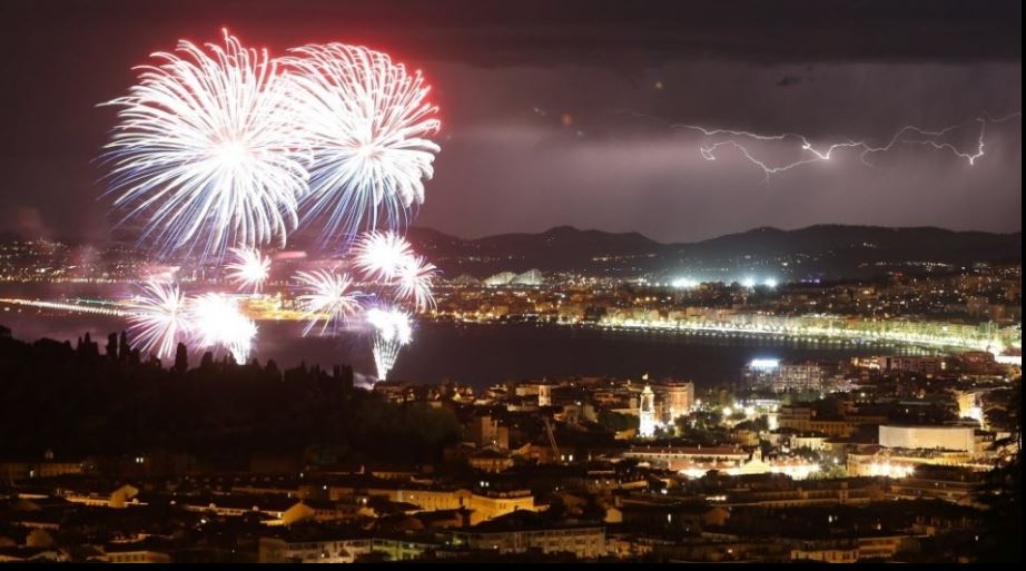 Foto registra explosão de fogos de artifício em Nice, na França, pouco antes do início do ataque com um caminhão em meio à multidão durante o evento de comemoração da Tomada da Bastilha, maior festa nacional francesa. O atentado deixou mais de 80 pessoas mortas, que foram atropeladas e baleadas pelo motorista. O incidente está sendo tratado como atentado terrorista.