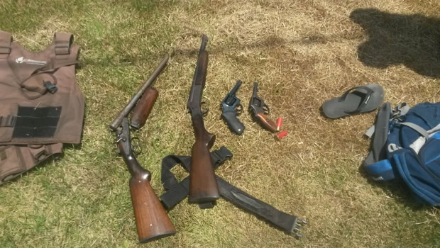 Com a quadrilha foram apreendidos dois revólveres de calibre 38, duas espingardas de calibre 12, toucas ninjas e máscaras, além de várias munições. Também foram apreendidos os objetos roubados do vigilante, um cassetete, o colete aprova de bala e a motocicleta.