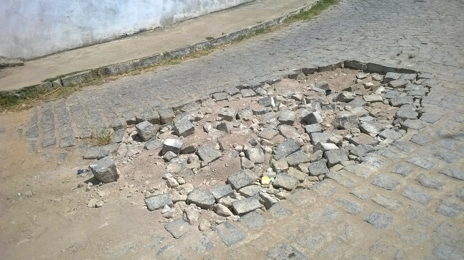 A segunda imagem também é merecedora de atenção mais que urgente por parte da Secretaria de obras e Infraestrutura. Esse local na foto abaixo fica na subida da ladeira por trás do mercado de carne. Por causa do tráfego constante de veículos, e em se tratando de um final de estrada de barro e começo de via saneada, aos poucos, de um pequeno buraco no calçamento, já está virando uma cratera. As pedras estão se soltando. Logo, se não for recuperado, em breve não haverá condições de trafegar por lá.