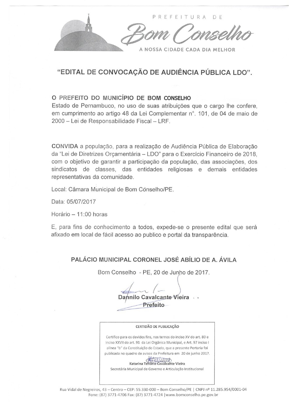 Prefeitura de Bom Conselho, convida para Audiência Pública para elaboração da LDO 2018