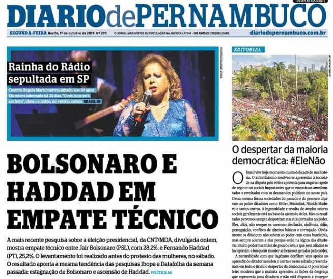 O Jornal Diário de Pernambuco divulgou nesta segunfa-feira (01/10) uma pesquisa onde mostra empate técnico entre Jair Bolsonaro (PSL),com 28,2% e Fernando Haddad (PT), 25,2%.