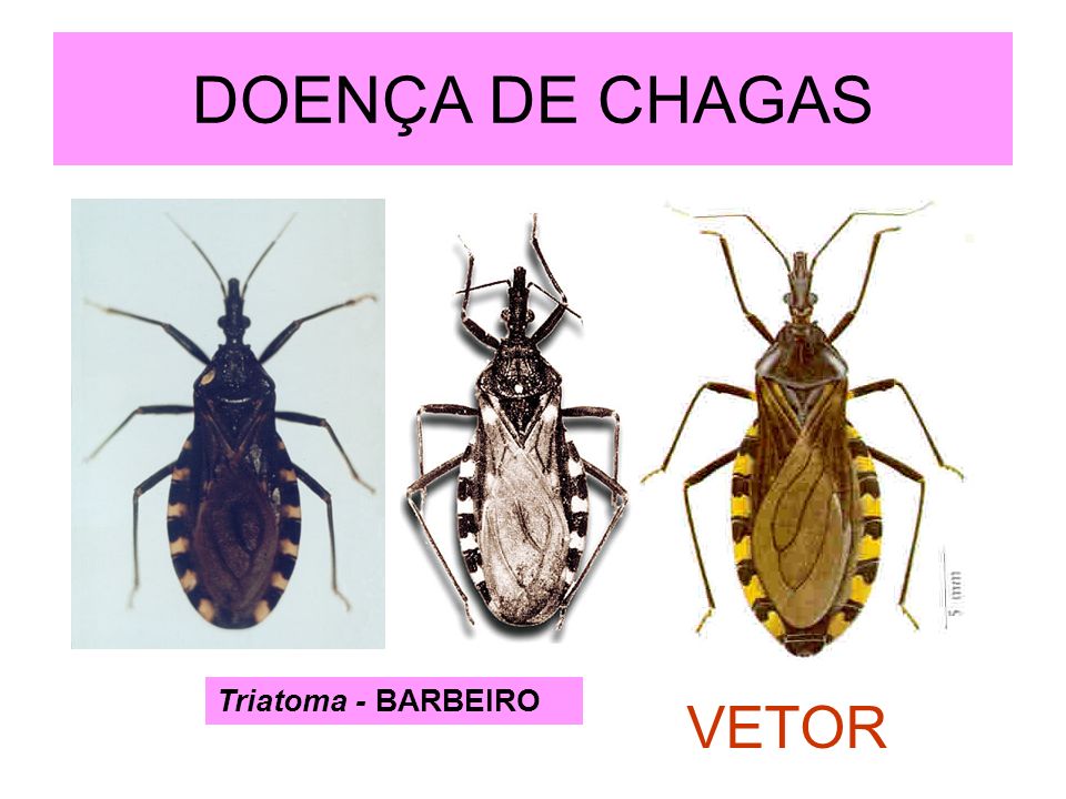 A doença de chagas é uma doença parasitária, transmitida pelo inseto triatomíneo, conhecido como “barbeiro”. Apresenta duas fases clínicas, a aguda, que pode não ser percebida, com febre, mal estar, dor de cabeça, entre outros. Quando não identificada e tratada pode evoluir para a fase crônica, que pode ser assintomática ou atingir órgãos importantes como o coração, intestinos e sistema nervoso.