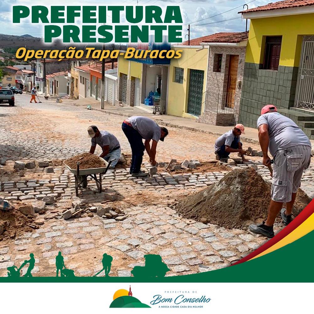 As chuvas que caíram sobre Bom Conselho no último dia do ano danificaram calçamentos em vários setores da cidade e no primeiro dia útil do ano a prefeitura já deu início a operação para a recuperação das vias atingidas.