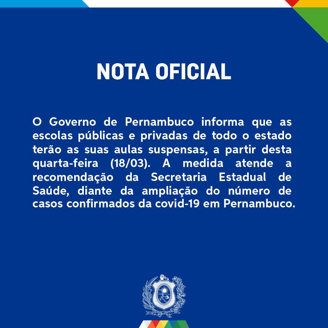 Governo de Pernambuco determina a suspensão das aulas em todo o Estado