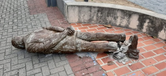 A estátua do escritor Ariano Suassuna, localizada na Rua da Aurora, região central do Recife, apareceu quebrada na altura das pernas e caída no chão, nesta segunda-feira (21).