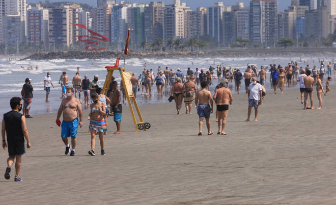 O tempo firme e as temperaturas em elevação na maior parte do país levaram os brasileiros às praias neste sábado (5). Imagens da areia em Pernambuco, no Rio de Janeiro e em São Paulo, porém, mostraram alguns pontos de aglomeração de pessoas e falta do uso de máscaras — regras impostas pelas prefeituras locais. Calçadão e areia ficaram lotados em Ipanema e muitos desrespeitaram regras de prevenção ao coronavírus. Santos também teve movimento intenso.